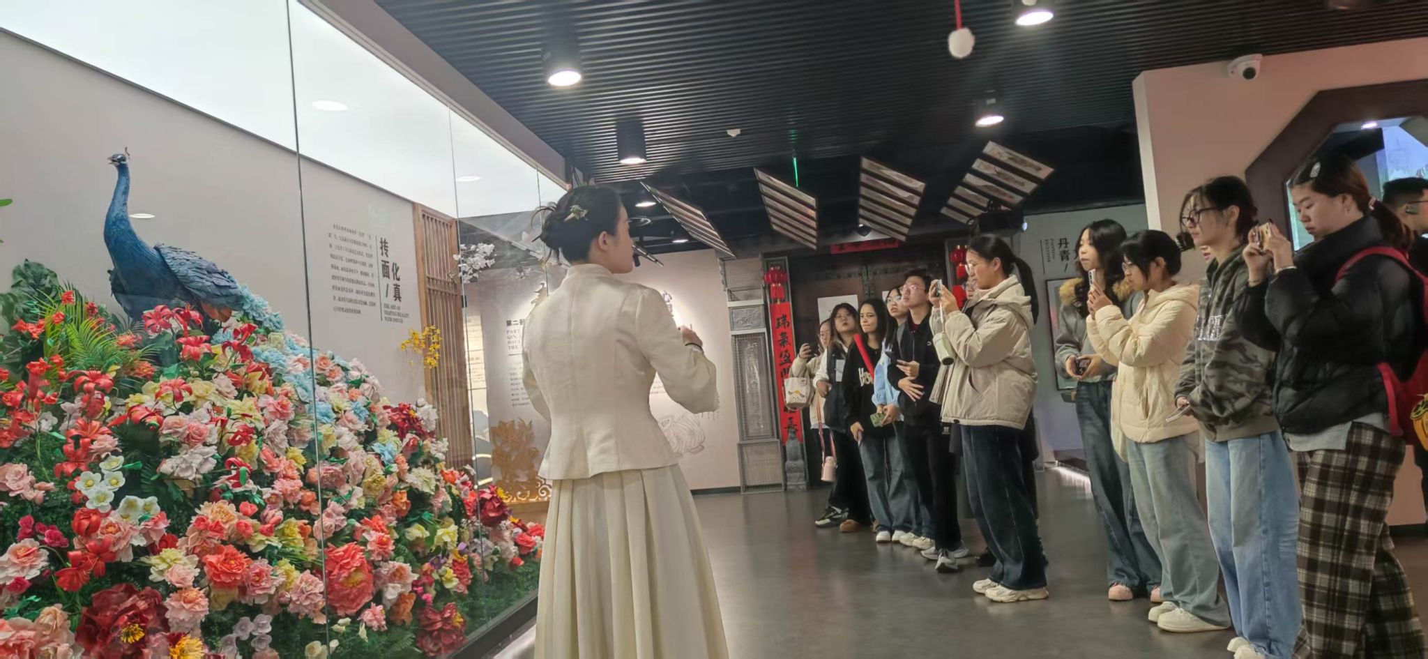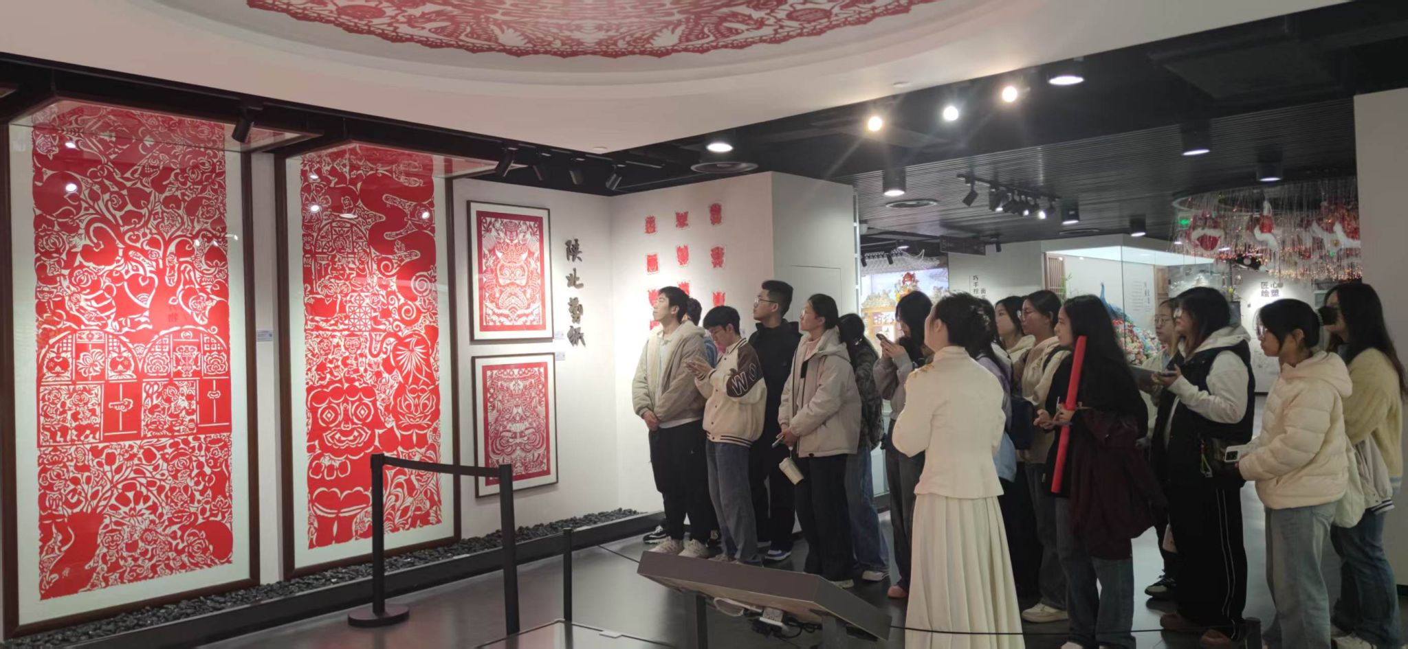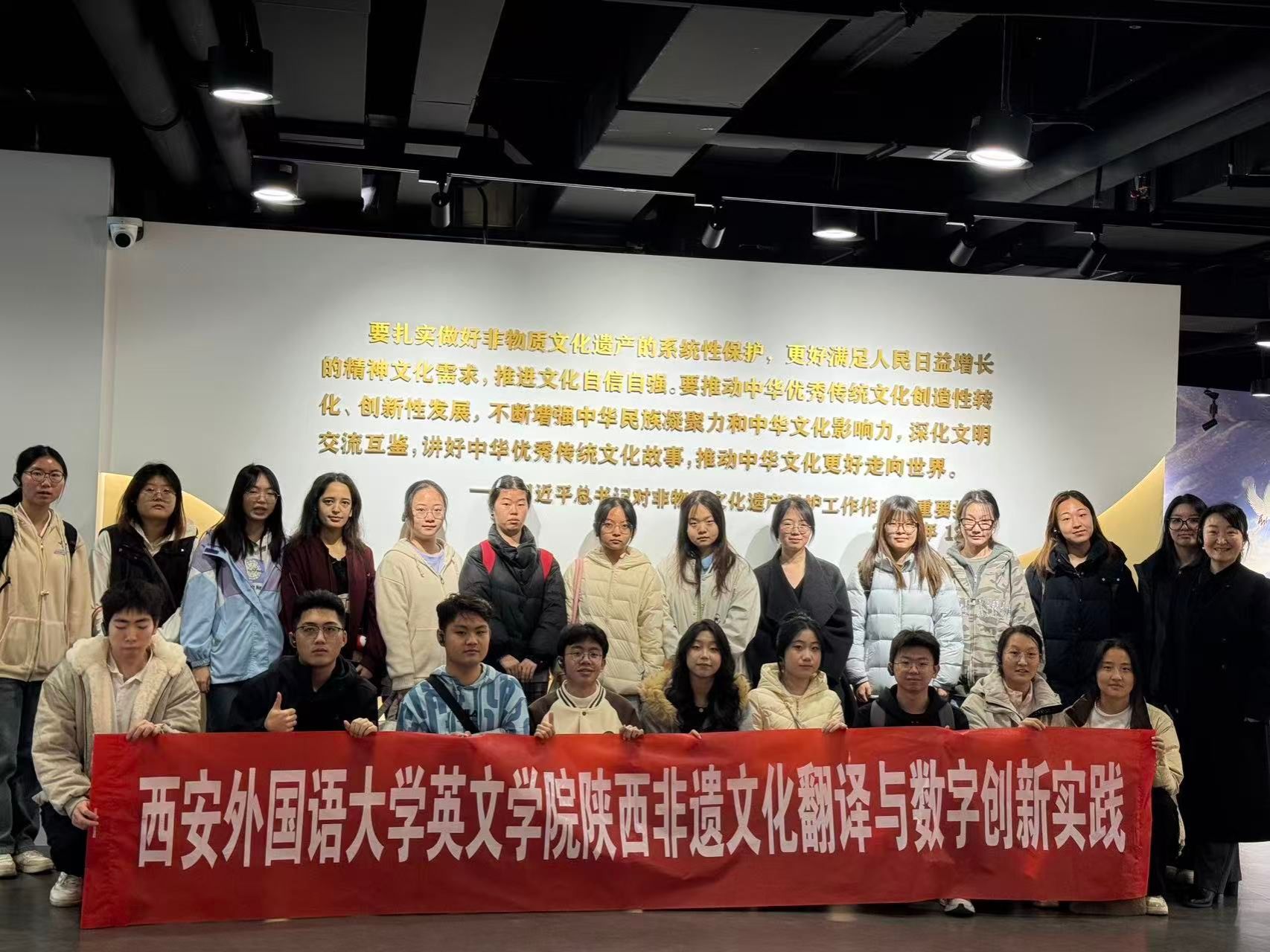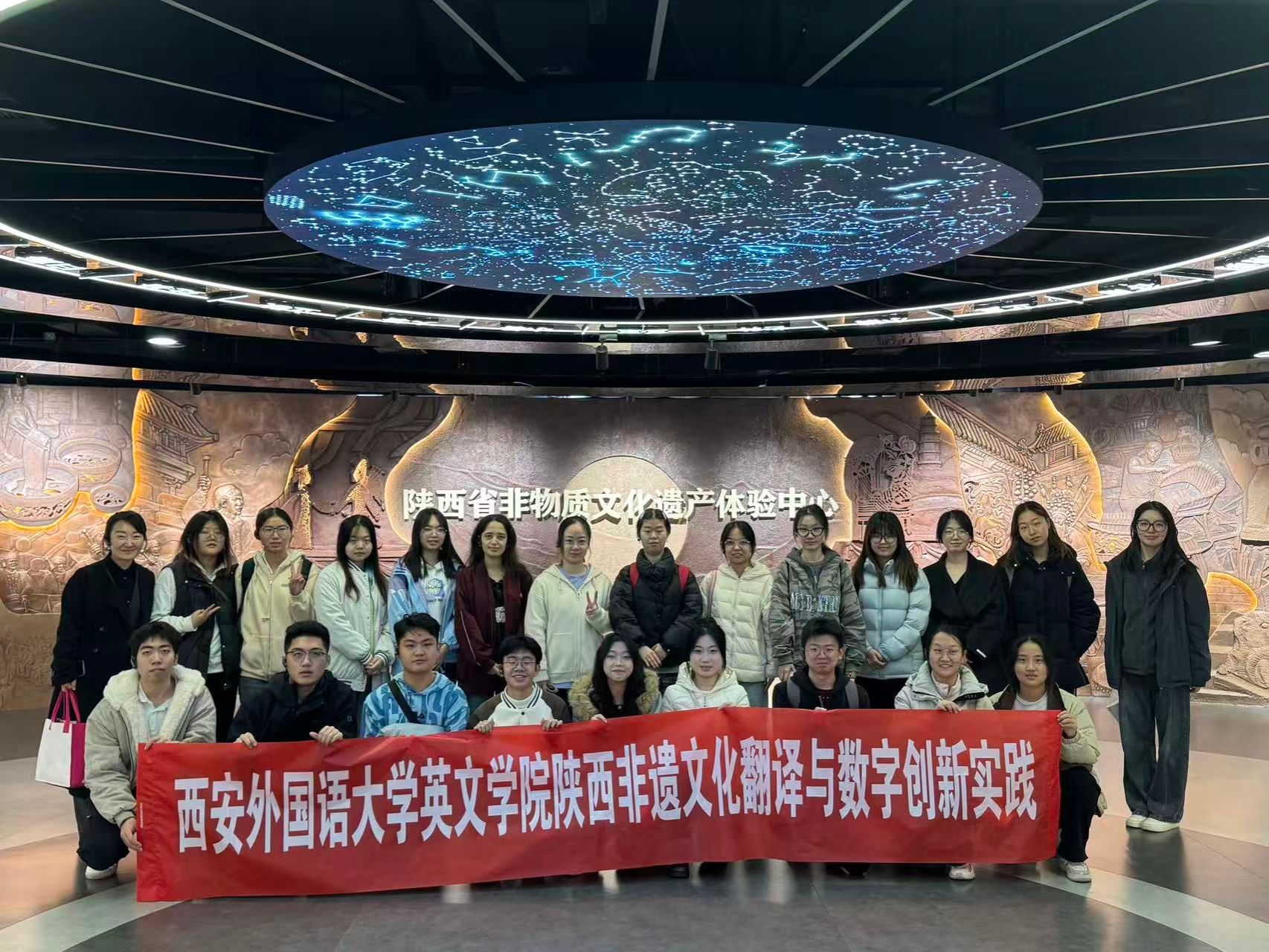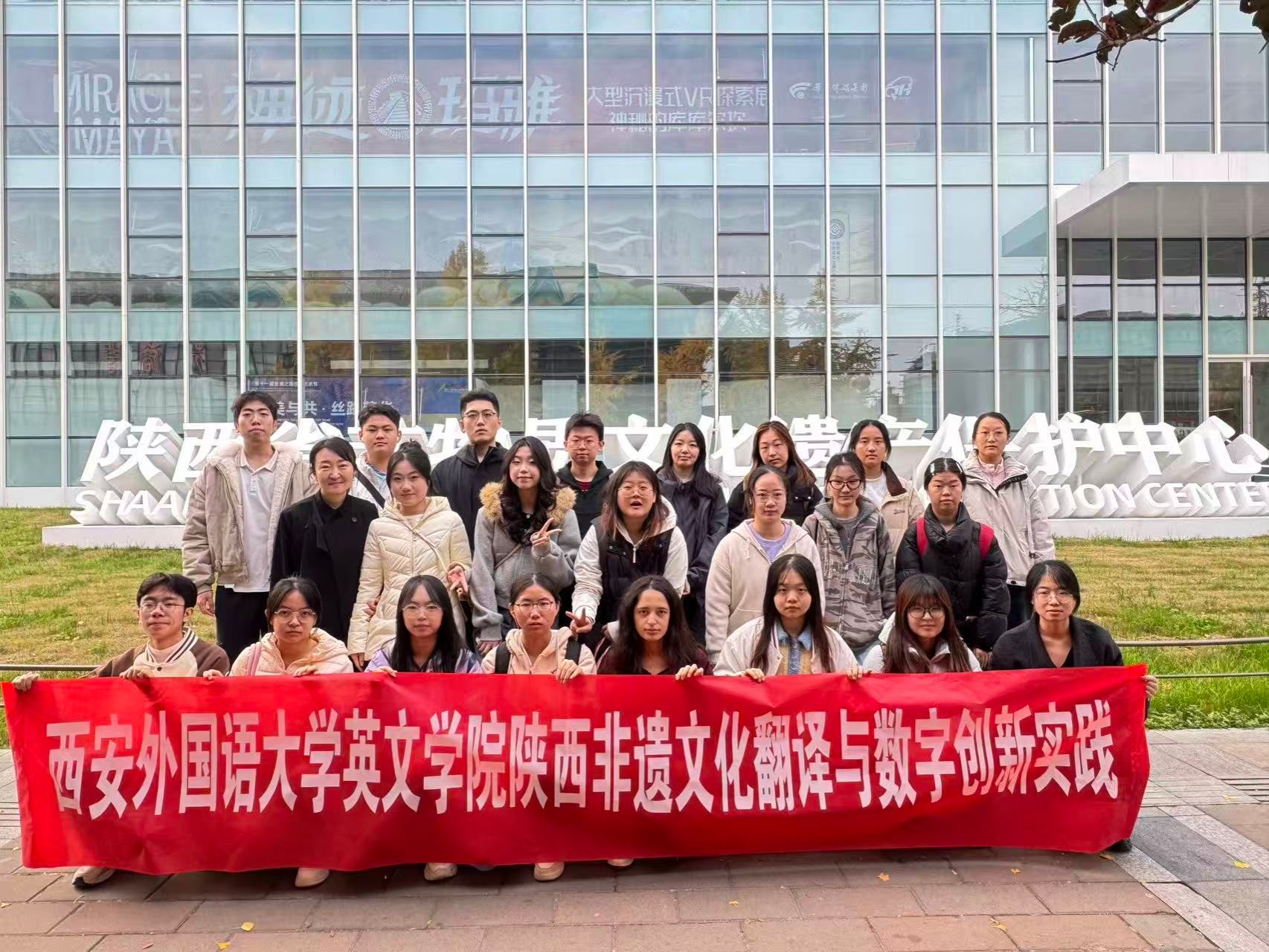 23名同学在完成“陕西省非遗文化翻译与数字创新实践课程”的校内学习后,在马丽萍老师的带领下,前往陕西省非遗体验中心开展了一场沉浸式研学活动。这次行程不仅是一次文化认知的拓展,更是一堂生动的专业实践课,将语言学习与文化传承紧密相连。