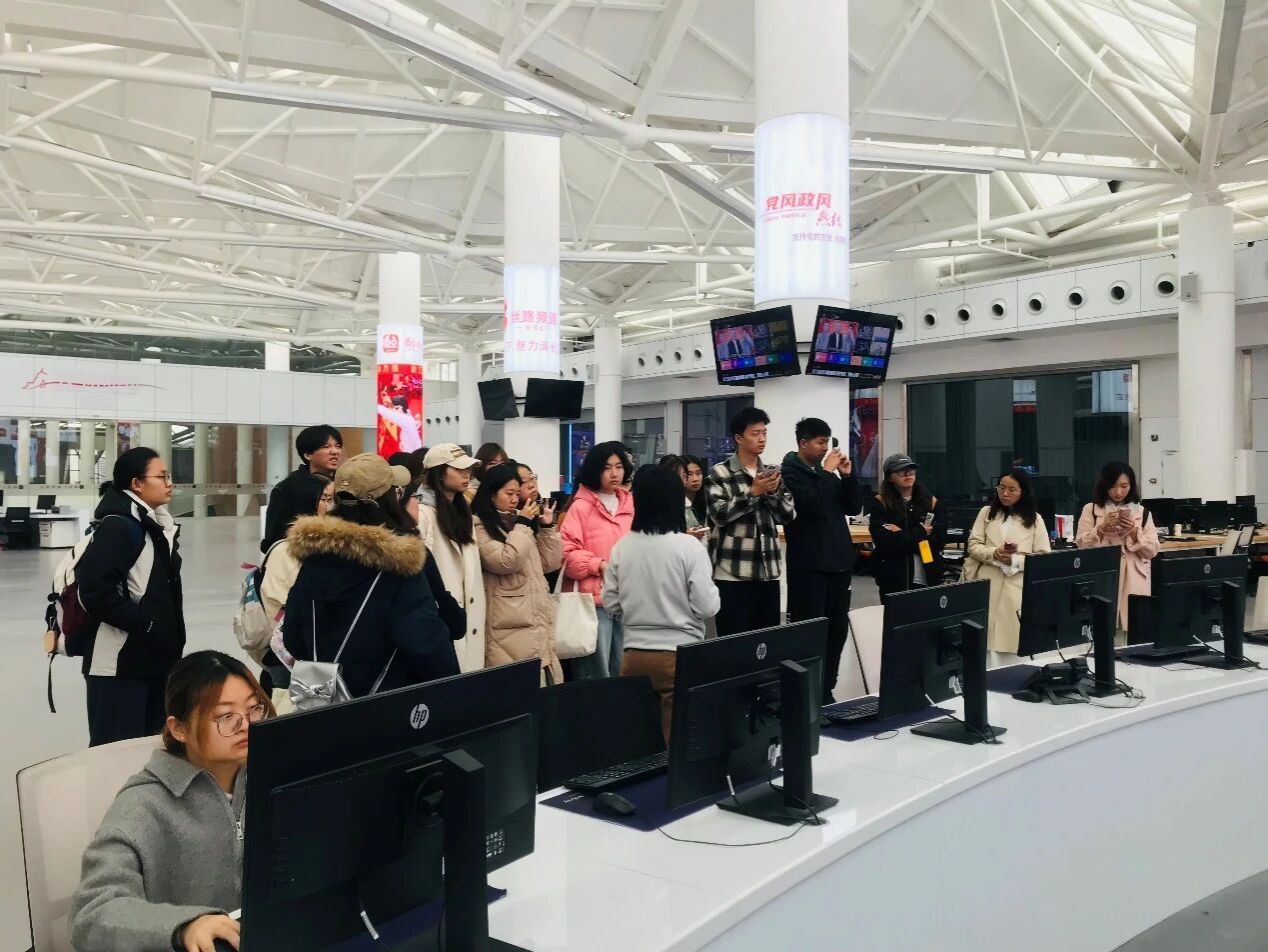西安市广播电视中心丝路频道总监高震、副总监李叶硕及《行走丝路》栏目责编郭秋林对师生一行表示热烈欢迎,随后陪同参观了新闻播报大厅与后台剪辑机房,通过实地演示与现场讲解,让师生直观感受广电中心专业高效的工作氛围,深入了解新闻工作者的职业素养要求、新闻播报全流程及国际媒体合作机制,真切体会到该中心在陕西本土文化海外传播中的战略核心地位。